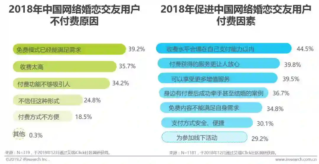 根据艾瑞调研显示,网络婚恋交友44.5%的付费用户表示,收费水平在其支付能力以内是其产生付费行为的核心原因,此外收费获得的服务更让人放心和可以享受更多增值服务也是近4成用户使用付费服务的核心原因。而用户不付费的核心原因主要有免费模式已经满足需求、收费太高、付费功能不吸引人,用户占比分别为39.2%、35.7%和34.2%。