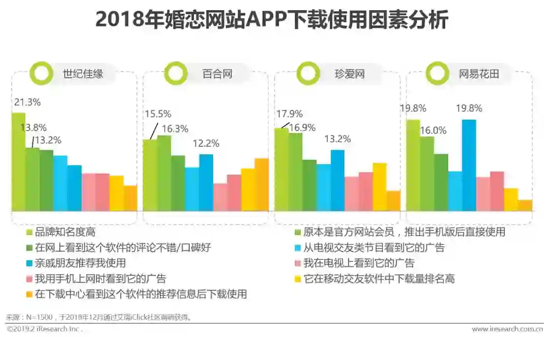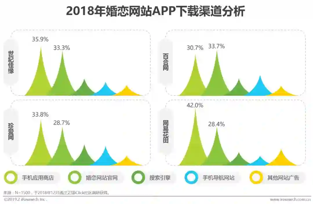 根据艾瑞调研显示,用户下载App的渠道大多为手机应用商店搜索下载,其次为婚恋官网。