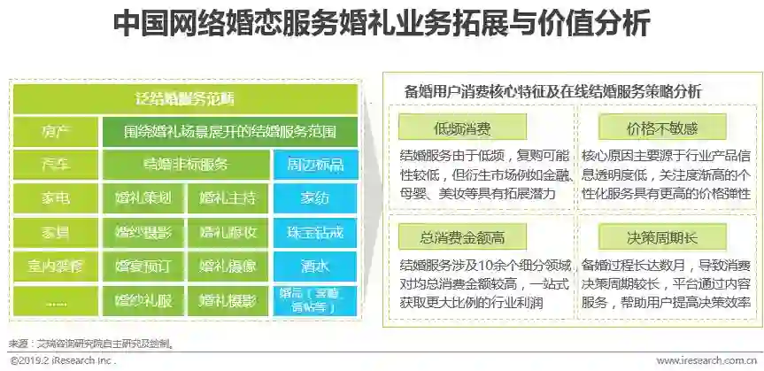 现阶段网络婚恋核心服务企业不断拓展产业服务范畴,借力品牌优势深耕婚礼领域拓展市场空间。目标市场具有分散度较高且结婚消费不连续的特征,而通过网络婚恋交友平台延伸的线上备婚服务平台通过整合产品信息和社交化的内容分享,将备婚用户聚合并匹配给线下各细分结婚服务企业,其核心价值在于大幅降低传统结婚服务企业的获客成本。未来随着90后以互联网为核心信息获取渠道的原生网民,逐渐成长为核心决策群体,以及跨地域结婚服务渐趋成熟从而打破地域服务限制,通过网络婚恋交友服务延伸的线上结婚服务平台,将成为产业链利益分配的核心关键节点,对网络婚恋交友服务市场的进一步发展将有诸多裨益。