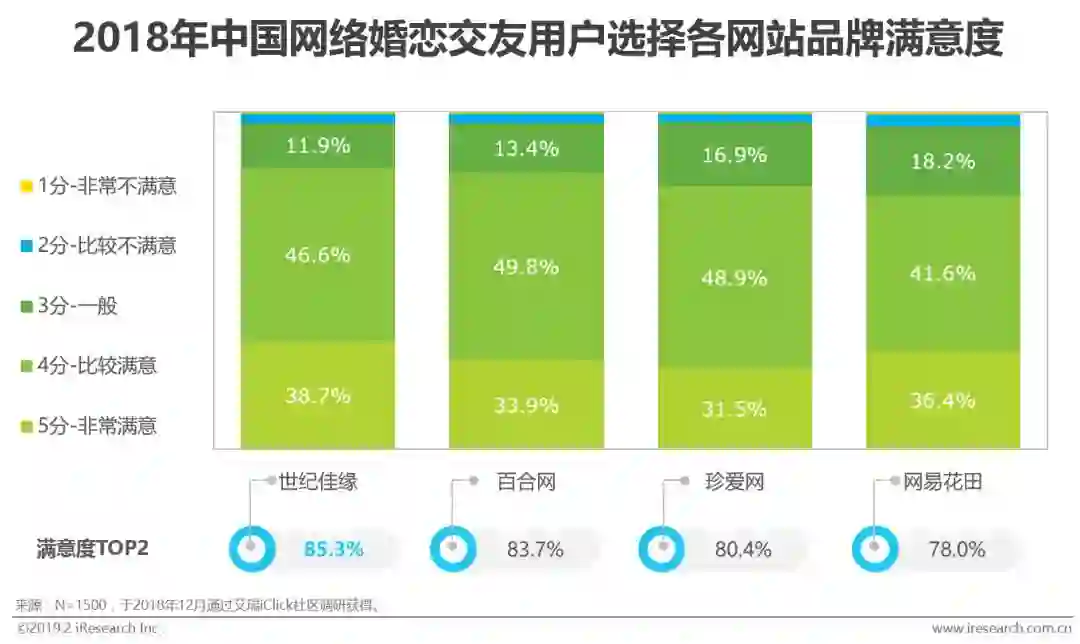 根据艾瑞调研显示,用户对几家婚恋网站在满意度上的评分普遍积极,世纪佳缘、百合网、珍爱网满意度TOP2(非常满意得分占比+比较满意得分占比)均达到80%以上,其中世纪佳缘网站的用户满意度评分达85.3%;这或与三个网站极佳的口碑传播基础有关。