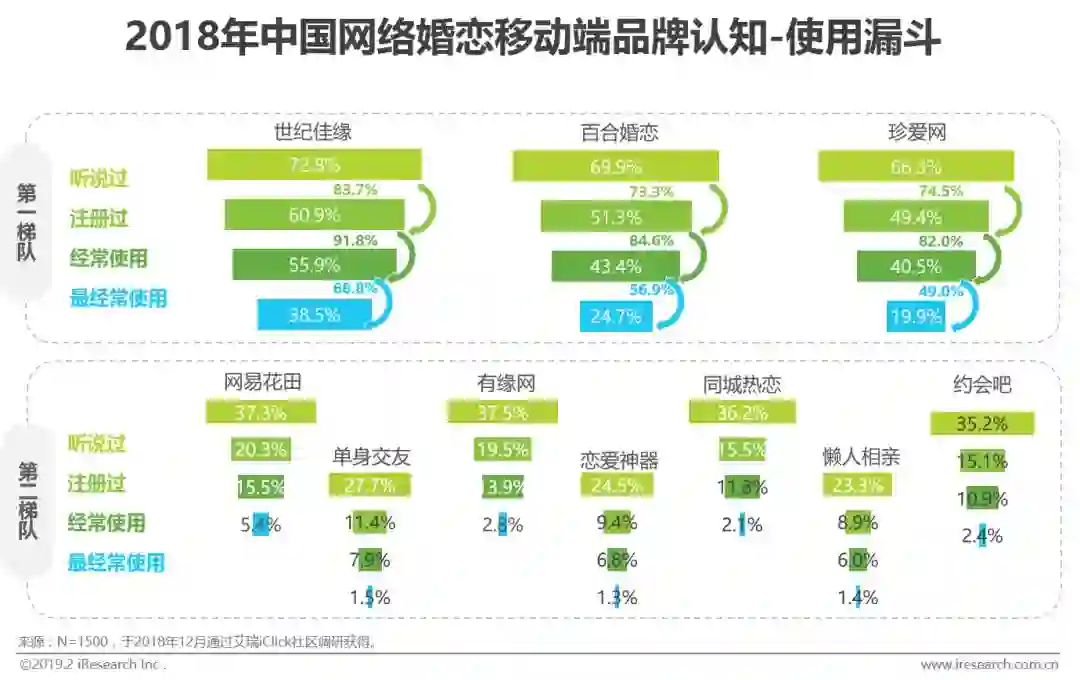 与PC端一致,移动端世纪佳缘、百合网、珍爱网处于用户认知使用的第一梯队,其中世纪佳缘是用户最经常使用的品牌