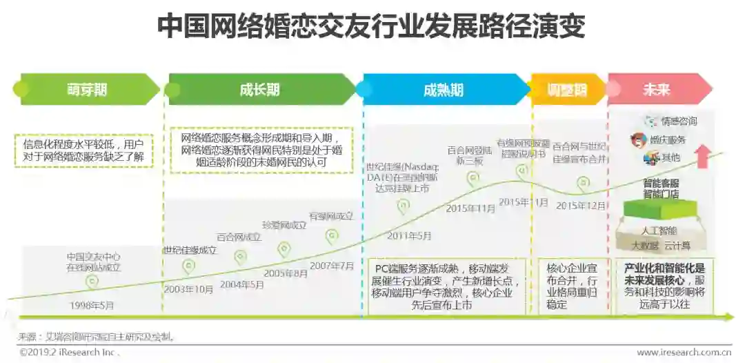 梳理20年来的网络婚恋交友行业发展历史,按照行业发展历程中不同时期的核心服务模式成熟度与资本化阶段划分,可分为“萌芽期“、”成长期”、“成熟期”、以及刚刚经历过的“调整期”。在萌芽期,由于互联网整体线上服务处于探索阶段,行业核心驱动主要为PC端网站服务能力构建;随后的成长阶段,核心企业在资本加持下陆续入局,PC端服务模式也趋向成熟,市场策略成为影响竞争格局变化的指挥棒;而进入成熟期后,移动端发展为行业带来新增长点,并在资本推动下迎来行业核心代表企业上市征程;随后进入调整期。现阶段随着人工智能、大数据、云计算等技术对互联网乃至各产业的影响逐渐深入,基于婚恋服务为核心的衍生服务拓展和智能化服务提升将是行业发展的主旋律。