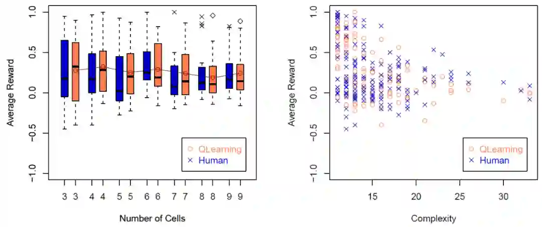 为了更详细地看到练习的结果,图 20(左)显示了按练习汇总的结果(每个数字都有一个练习),具体包括每个练习的 Q-learning 和人类完成任务情况的平均值、中位数和散度。观察每个空间大小的曲线图,我们还可以看到,Q-learning 和人类在 7 次练习中的表现并没有显著的不同。图 20(右)为 20x7x2=280 个练习的平均奖励结果。人类比 Q-learning 有更高的离散性。这可能是由于 20 个人类是不同的,他们的能力各有不同,而 Q-learning 在 20 个测试中的每一个算法都是完全相同的,他们的能力是相同的。