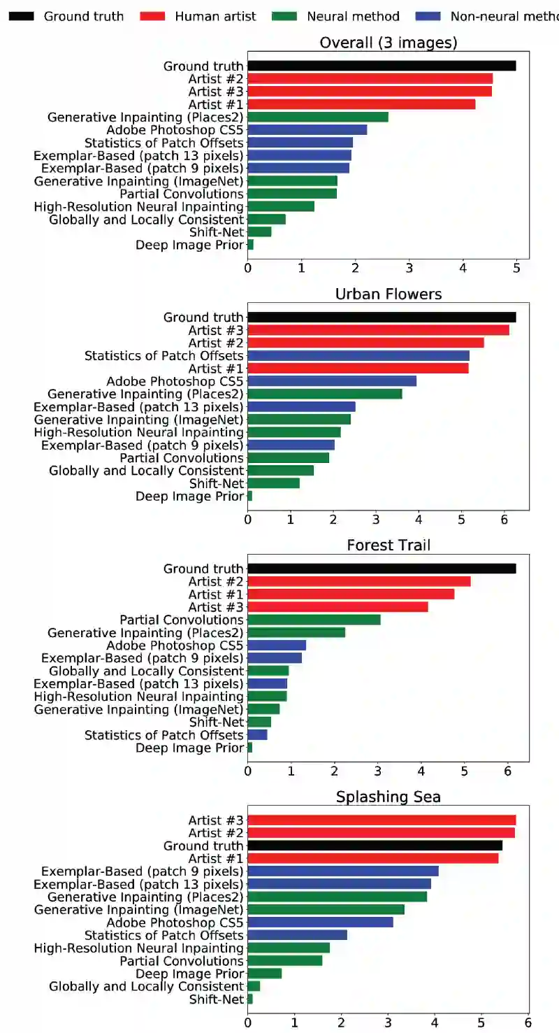 从这个竞赛的结果可以看出,艺术家们的表现在大多数照片中大大超过了自动方法。只在一种情况下有一种算法击败了艺术家:用非神经网络方法(8、Statistics of Patch Offsets for Image Completion)修复的 “Urban Flowers” 图像比艺术家 1(Artist#1)绘制的图像排名更高。此外,艺术家修复的图像与原始未失真图像的效果不相上下,甚至看起来更好:艺术家 2(Artist#2)和艺术家 3(Artist#3)修复的 “Splashing Sea” 图像的质量分数高于 Ground truth,艺术家 3(Artist#3)修复的 “Urban Flowers” 图像的得分仅略低于 Ground truth。所以,在图像修复的任务中,人类还是远胜于机器的。不过值得注意的是,在这个实验中,参与者是艺术家,也就是说,是具备一定绘画和艺术能力的人。对于普通人来说,他的修复能力就一定能比机器好么?