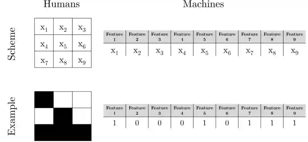 为了获得相同数量的特征,只使用 3x3 矩阵,有 9 个元素(=9 个特征),每个特征都是二进制的。据此,有一组 2^9 =512 个二元矩阵。这些矩阵可以显示为黑白元素的图片(对人类而言),也可以显示为特征为 1 和 0 的数字列表(对机器而言)。图 10 给出了同一个实例分别对人类和机器进行表示的例子。