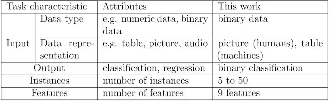 作者选择了一个以二进制作为输入、二进制分类作为输出,包含一小组训练实例和有限数量特征的任务。具体任务特征和实现方式见表 1。