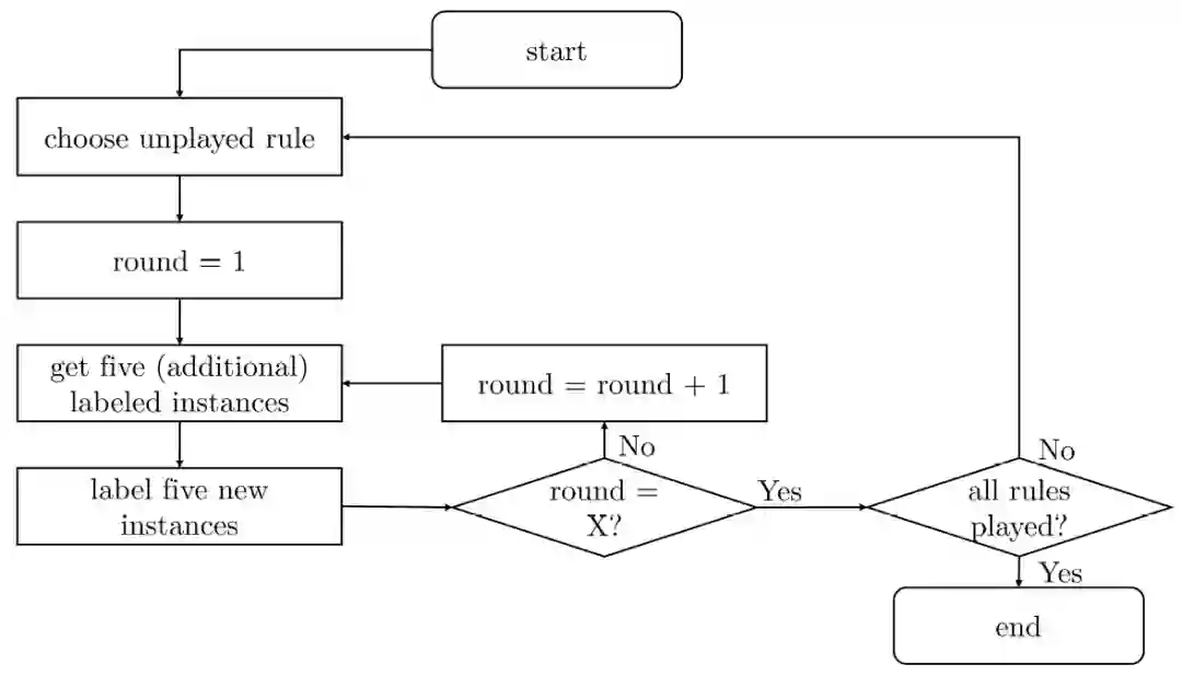 设计一个多回合游戏以生成 一个符合特定规则的学习曲线。在游戏过程中规则不会改变。在游戏开始时,玩家收到访问 5 个标记的实例(训练数据)。确保每个实例被标记为正值的概率为 50%(相应地也有 50% 被标记为负值),以根据所选规则来考虑数据集中正值和负值标记实例的不平衡的问题。此外,玩家还收到 5 个未标记的实例(测试数据),这些实例必须根据从标记的训练实例中得出的知识进行标记。如前所述,每个实例被标记为正的概率仍为 50%。然后,我们用准确度量来衡量测试数据的性能,准确度量表示为正确标注实例的数量除以标注实例的总数量。