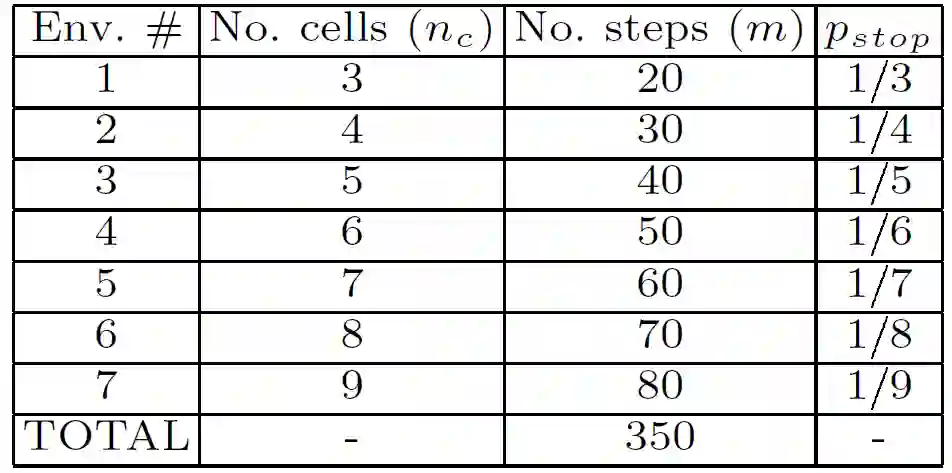 最初,每个 Agent 被随机(使用统一分布)放置在一个单元中。然后,我们让 Good、Evil 和被评估的 Agent 在一定的步数 m 内进行交互,称之为一个练习 exercise(或情节 episode)。对于一次练习,我们将获得的奖励进行平均,所以给出环境中 Agent 的得分。测试过程是由一连串的练习或情节组成的。我们将使用 7 个环境,每个环境都有 3 到 9 个单元格(n_c)。Good-Evil 模式的大小将与单元格的数量成正比,使用 p_stop= 1/n_c。在每个环境中,我们将允许 10x(n_c-1)个步骤,这样 Agent 就有机会发现环境中的任何模式,也有可能利用一些进一步的步骤来利用这些发现。表 2 给出了测试任务的控制指标。