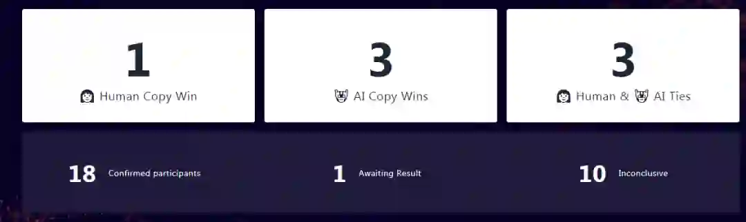 目前已经给出的竞赛结果如下图。在 18 份有效参与竞赛中,有 1 项明确人类生成的文案胜过 AI 生成的文案,有 3 项则是判定 AI 获胜,还有 3 项判定是双方平手,其余 11 份则暂无打分(含一项还未最终完成)。
