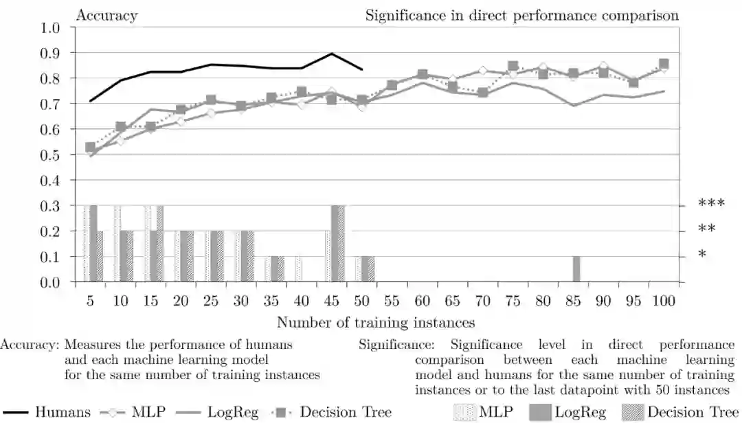 这项工作关于一个学习曲线描述任务,拟解决的是在小样本量的前提下完成二进制分类任务时人类和有监督机器学习模型的学习曲线有哪些不同。具体的工作分析和结果在文献 [3] 中,并以预印的形式发布在 arxiv 中(https://arxiv.org/abs/2012.03661)。