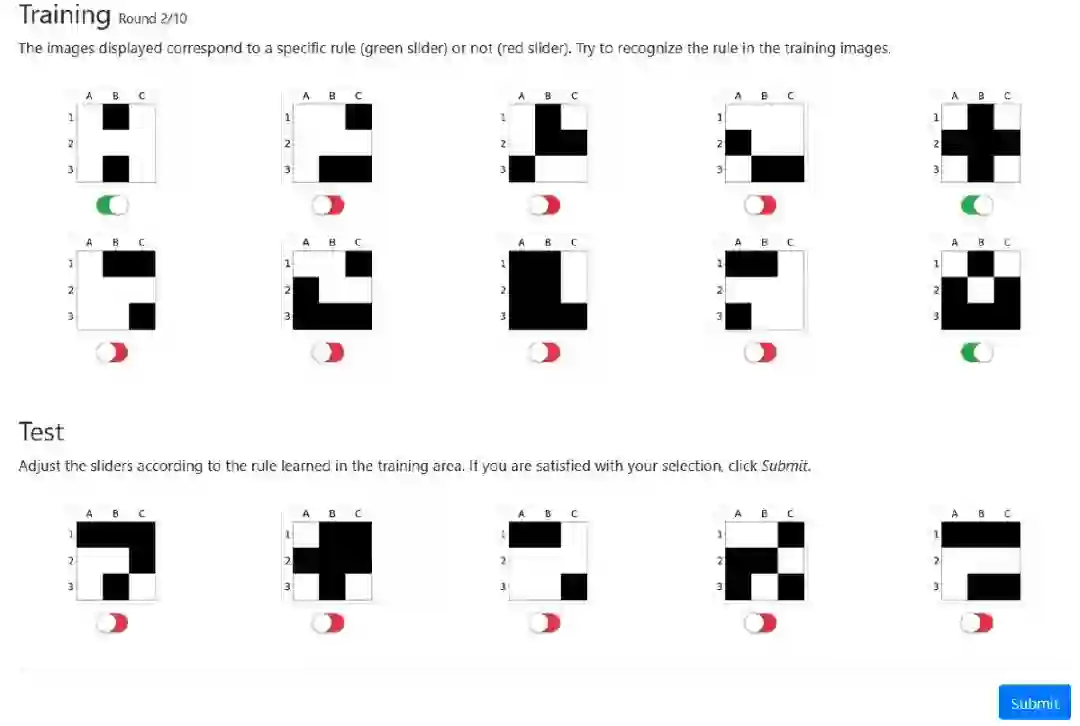 图 12. 规则对称性(Symmetry)的第 2 轮人类的实验截图。上方显示 10 个训练实例,下方则是未标记(测试)的实例