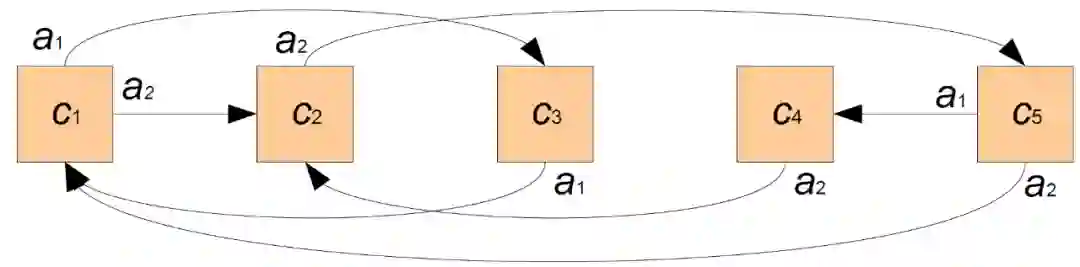 图 17. 一个有 5 个单元格和 3 个动作(a_0, a_1, a_2)的空间,反射动作 a_0 未显示