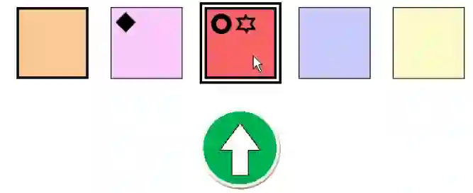 人类的实验是通过研究不同环节的参与者进行的,这些人是在没有任何事先知识的情况下单独参加实验的,因此参与者并不是根据特定知识背景、行业能力等进行筛选的。不过,事先他们会得到一份关于实验总体目标、用户界面布局和一些抽象例子的标准化介绍。每位参赛者参与四场游戏,有可能玩遍四种规则。每场总轮数为 10 轮,也就是说,参赛者总共会看到 50 个标签实例,在一局游戏中,有可能需要他 / 她给 50 个实例贴标签。在完成一个游戏后,参与者不会收到任何关于他 / 她表现的反馈,这就保证了每轮游戏的独立性。图 12 是用人类进行规则对称性实验的 GUI 实例。