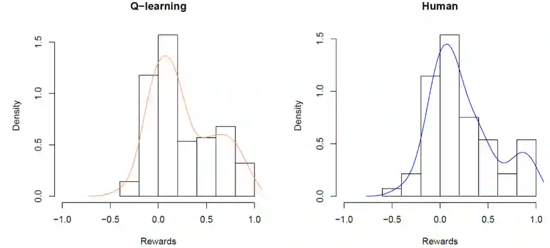 图 19. Q-learning(左)和人类(右)的(20 x7=)140 个练习的直方图,线条显示的是概率密度