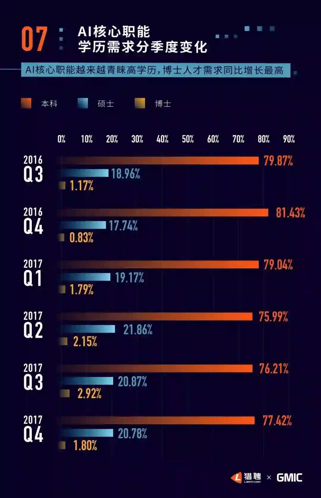 AI的高科技属性使它拥有较高的学历门槛,而创新则是发展技术的第一要务,高学历者的研究能力和创造能力不论在企业价值的创造上,还是对产业的推动上都具有重要的意义。而且随着AI的发展,与其他前沿科技领域的交融也会越来越深广,高学历在这个领域将越来越受欢迎。