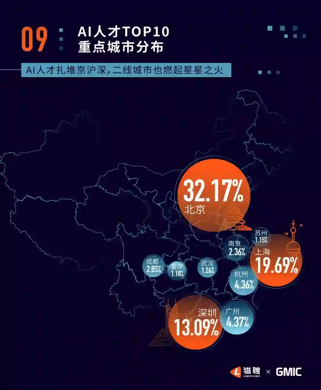 值得注意的是,杭州作为二线城市,在AI人才的比例上与一线城市广州相差无几,这或许与其根深蒂固的互联网基因密不可分。AI,作为新一轮经济增长的引擎,杭州的未来值得期待。