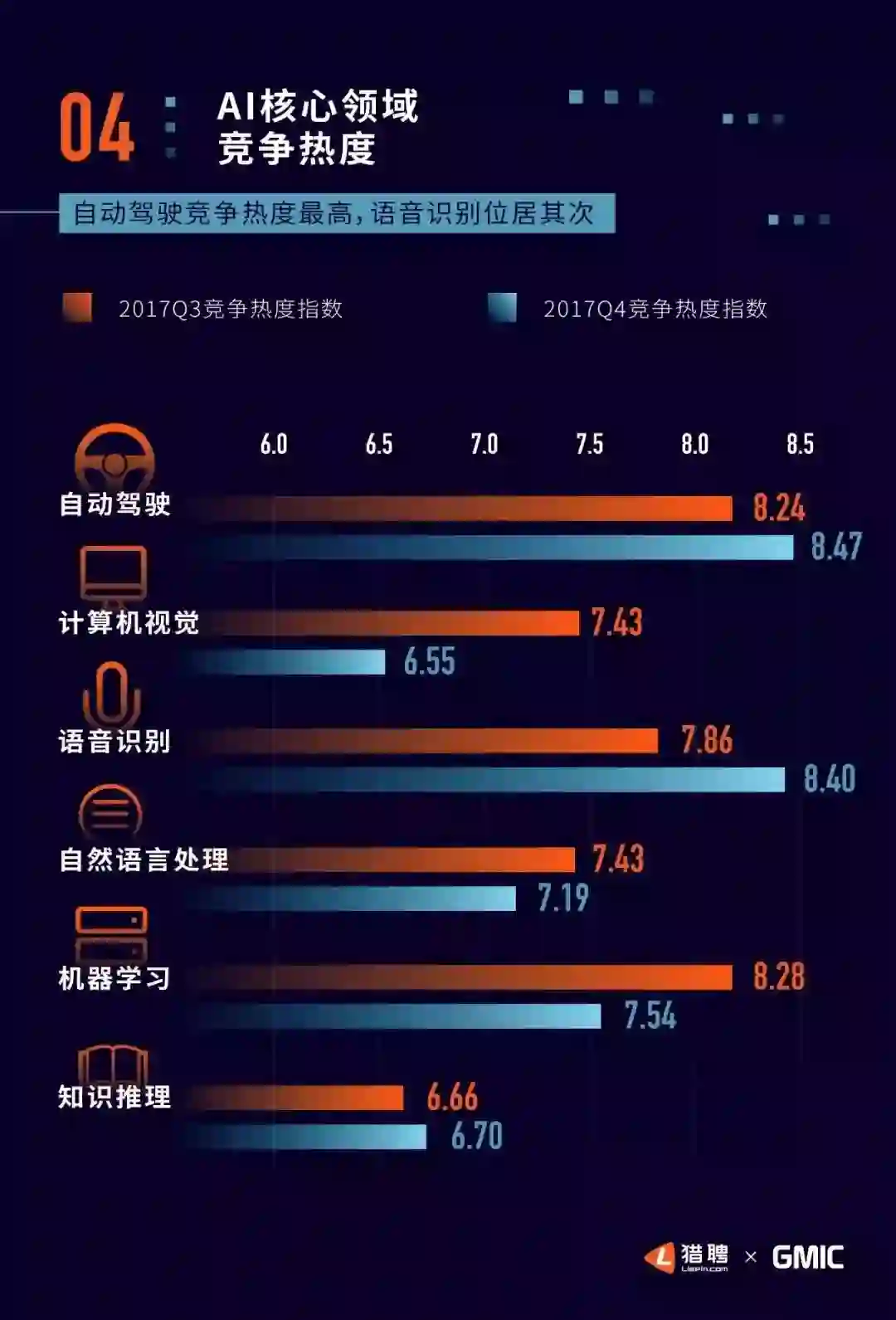 需要注意的是,除自动驾驶和语音识别在2017年第三季度到第四季度期间保持热度且有显著增长之外,其他几个领域的热度均有不同程度的降温。对目前工作有想法的朋友,请留意这一点。
