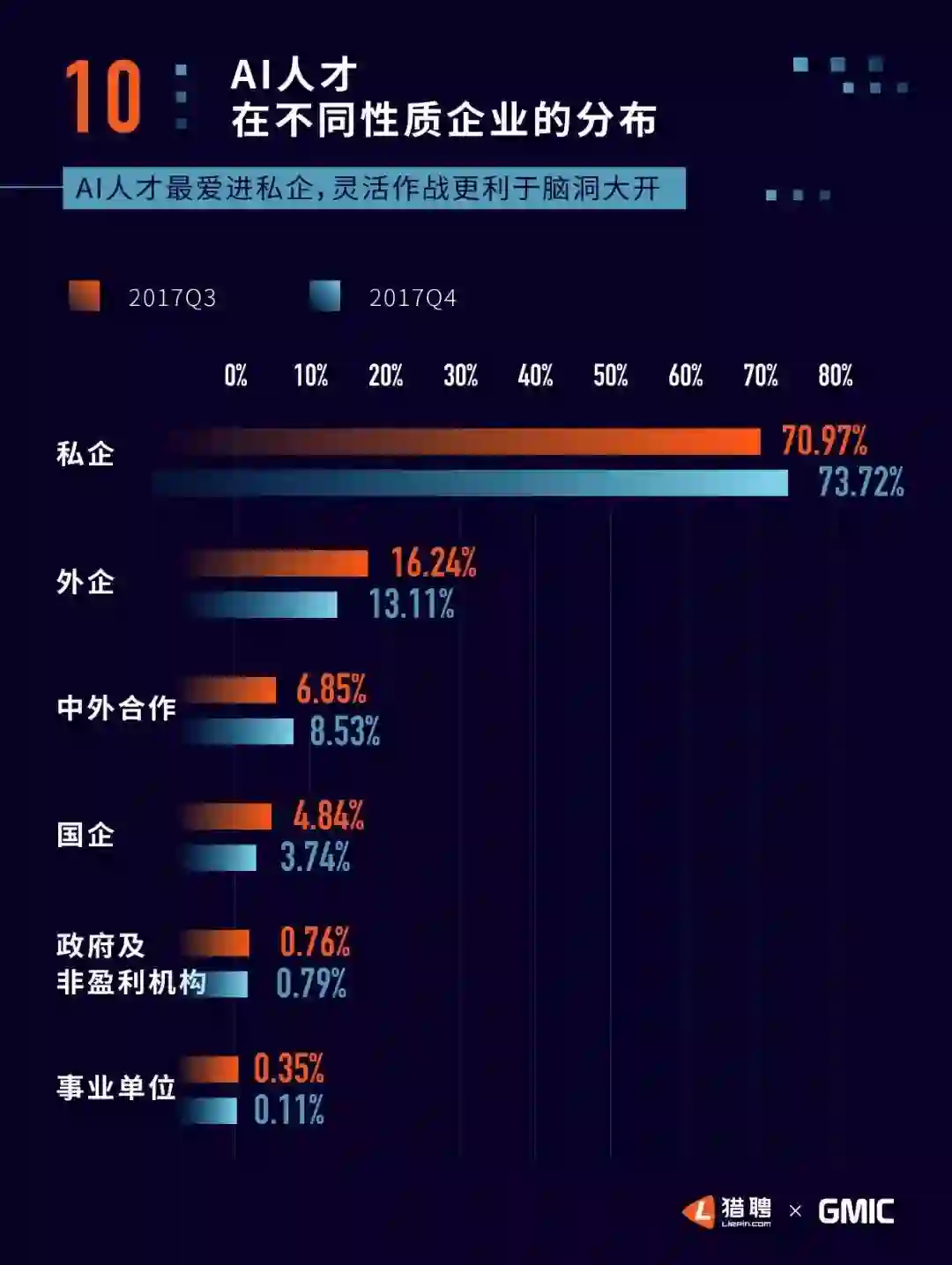 相反,在大习惯的认知当中,文化相对刻板、管理相对僵化的国企、政府及事业单位则很难获得AI人才的青睐。