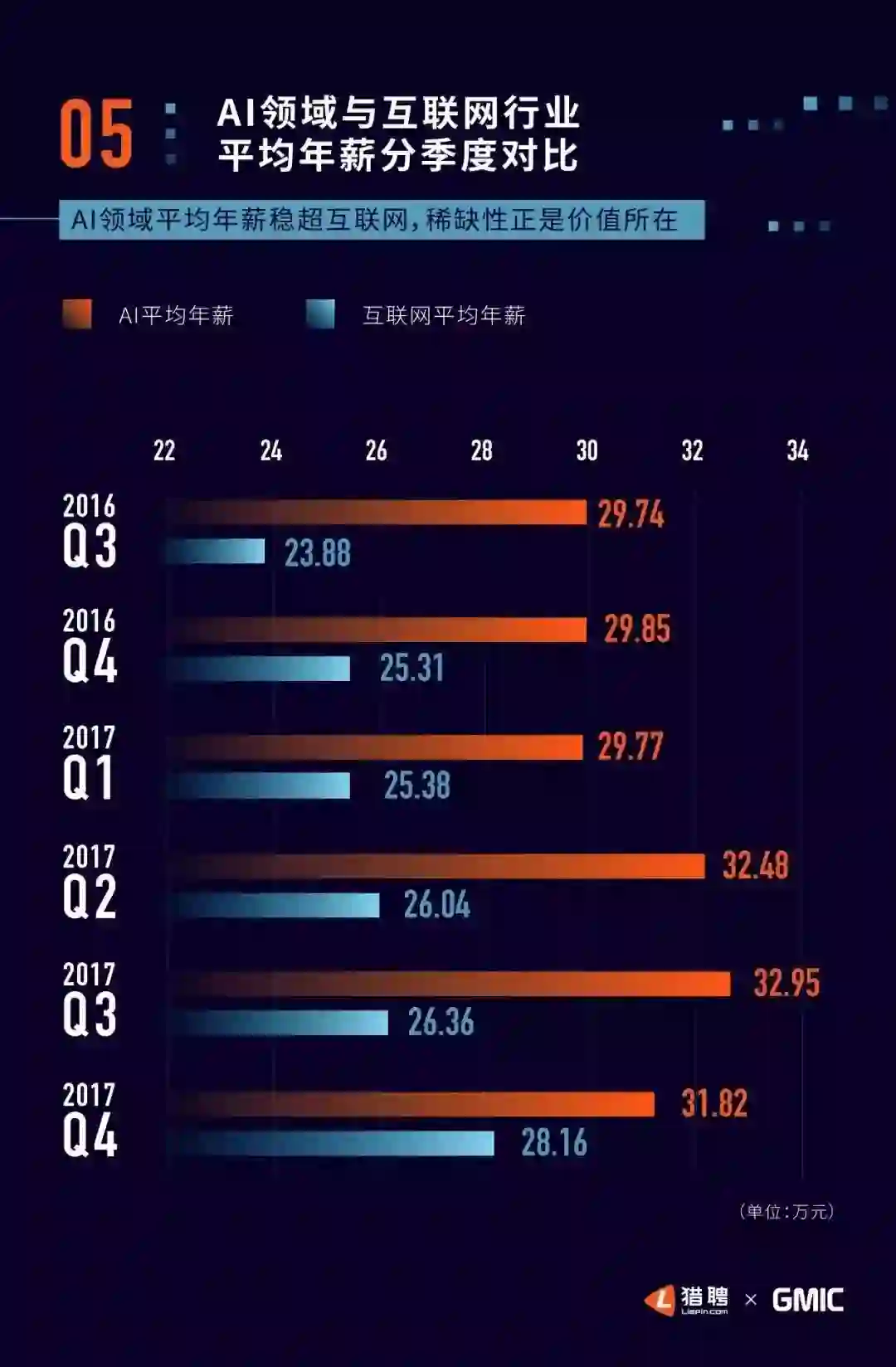 在过去的一年里,AI领域个季度的平均年薪整体均超过互联网行业。尽管在2017年第三季度到第四季度略有下降,但领先优势依旧明显。