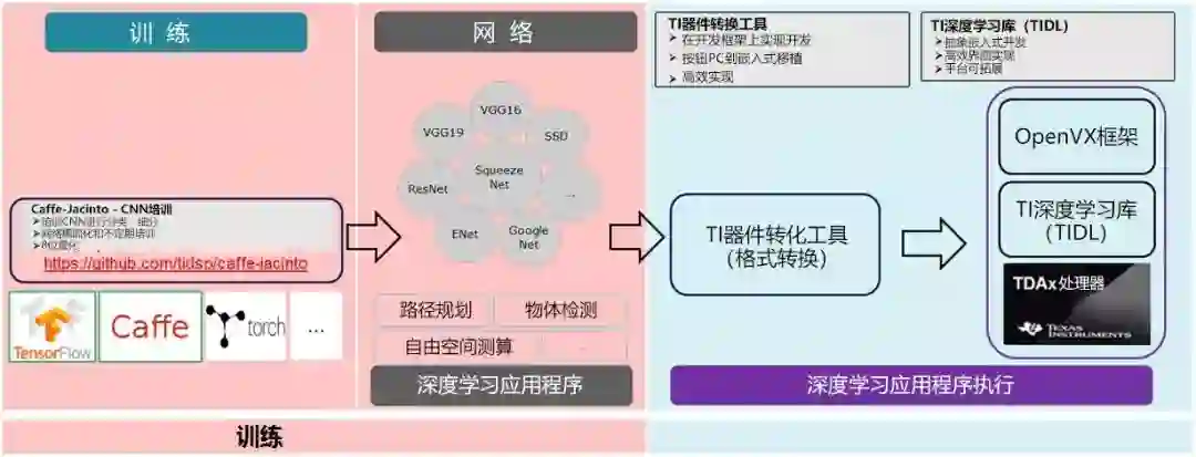 TIDL框架为软件可扩展性提供快速嵌入式开发和平台抽象;在TI硬件上实现用于加速CNN的高度优化的内核,以及支持从开放框架(如Caffe和TensorFlow)到使用TIDL应用程序编程界面的嵌入式框架进行网络转换的转换器。