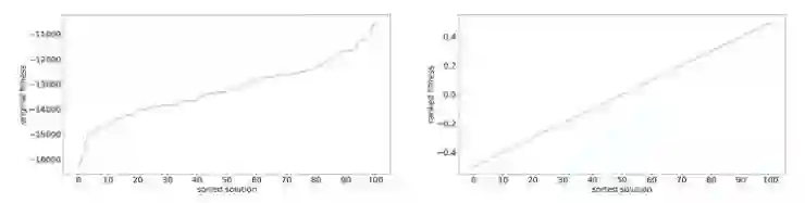 如果一个特殊的点 F(zm)比种群中其它的点 F(zi)都大得多,那么梯度可能被这个离群点控制,并且增加算法陷入局部最优的概率。为了缓解这个问题,我们可以使用适应度的排序转换。我们在这里不使用适应度函数的真实值,转而使用一个与解在种群中的排序成正比的增强适应度函数对结果进行排序。下图是分别使用原始的适应度和基于排序的适应度函数的效果对比图: