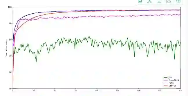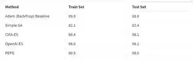 我们应该批判地看的这个实验结果,这是因为我们只运行了一次代码,而不是取 5-10 次运行结果的平均值。这个基于一次实验的结果似乎说明了,CMA-ES 模型在 MNIST 手写数字任务中是表现最好的,但是PEPG 算法也并没有差太远。这两个算法都达到了大约 98% 的测试准确率,比用作对比的基线 SGD 和Adam 低大约 1%。也许,能够动态地在每一次迭代中调整协方差矩阵和标准差参数的能力使得它能够微调权重,这比 OpenAI 提出的更简单的进化策略的变体要更好。