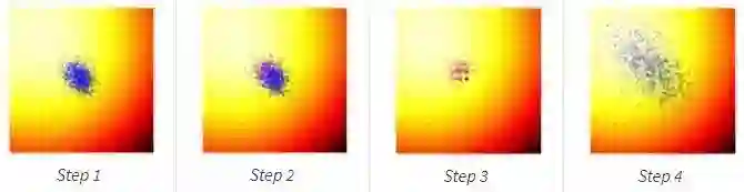 上面这两个公式可以被带回到梯度近似公式中,并且推导出明确的对 μ 和 σ 进行更新。本文之前提到的论文都推导出了更明确的更新规则,包含了一个用于比较的基线,并且可以引入其他的类似于 PEPG 中对偶抽样的蒙特卡罗技巧,这也是我们赖以执行算法的基础。举例而言,论文 Natural Evolution Strategies (NES, 2014) 提出了将 Fisher 信息矩阵的逆矩阵引入梯度更新规则的方法。然而,这个思想与其他的进化策略算法是相同的,它们都在每一代中更新了多元正态分布的均值和标准差,并且从更新后的概率分布中进行抽样得到新的解集。下图是这两个公式执行动作的可视化图解: