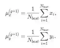 CMA-ES 巧妙地修正了上面的协方差计算公式,从而使得它能够适用于最优化问题。我会详细说明它是如何做到这一点的。首先,它的主要任务是找出当前这一代最优秀的 N 个解 Nbest 。为了方便起见,我们规定 Nbest 为最优秀的前 25% 的解。在根据适应情况将得出的解排序后,我们将仅仅通过当代(g)最优秀的前25%的解去计算下一代(g+1)的均值 μ(g+1),换句话说,我们的计算过程可以被表示为下面的公式: