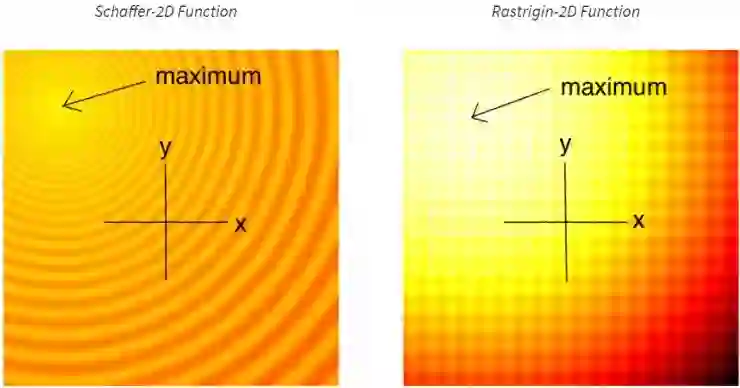 下图为转换后的二维的 Schaffer 函数和 Rastrigin 函数的俯视图,这两种函数常常被用作测试连续的黑盒优化算法的用例。在图片中,更亮的区域代表 F(x, y) 有更大的函数值。如你所见,这个函数有许多的局部最优点。我们要做的就是找到一系列的模型参数 (x, y),从而使 F(x, y) 尽可能地接近全局最大值。