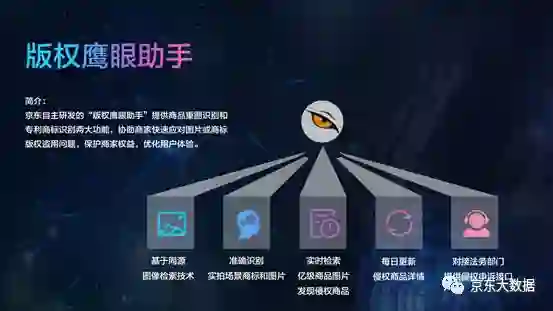 版权鹰眼助手:京东自主研发的“版权鹰眼助手”,提供商品重图识别和专利商标识别两大功能,协助商家快速应对图片或商标版权盗用问题,保护商家权益,优化用户体验。