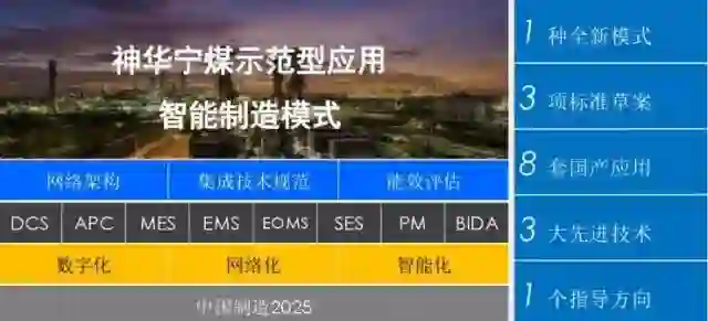 刚才讲到的都是我们的一些设计架构,接下来我想给各位说几个我们在实践中的一些突破。我们拿刚才提到的四个示范项目,第一个示范项目是神华宁煤,它是百万级烯烃装备的制造,我们用了一种全新的模式,三项标准、八套国产系统、三大先进技术、一个指导方向,分别对应在这里,我们《中国制造 2025》在这里一层一层体现出来。