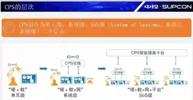 这里面信息物理系统分成三个级别,有单元级的、有系统级的、还有 SOS 系统之系统级。现在一般的智能化系统至少是有硬件、有软件,我们早期只有硬件,机械的装置可能只有硬件,没有软件。
