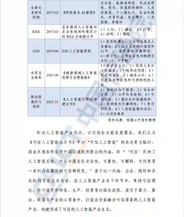 来源:中国信息通信研究院随着新一轮科技革命和产业变革的深入推进,人工智能呈现爆发式成长,广泛应用于日常生产、生活的方方面面,社会各界对可信品质的关注度也提升到了前所未有的高度。近年来,各界均在不断探索将更多的可信理念从基础能力、算法技术、应用场景和产品设备等不同层面进行融合实践,实现了人工智能在安全性、可靠性、可解释、可问责等一系列内在属性的可信赖程度逐步提升,为构建我国可信人工智能产业生态提供了有益参考。为广泛吸纳产学研用各界的优秀经验,中国信息通信研究院联合京东探索研究院及政产学研多家单位共同编写《可信人工智能产业生态发展报告》,对人工智能产业融合可信要素的发展态势进行总体分析,研判发展趋势并提出措施建议,希望能为社会各界提供借鉴和参考。报告主要观点如下:全球可信人工智能发展态势向好。人工智能监管向立法执法拓展,欧盟发布全球首部《人工智能法案》,美国推出《2022 算法问责法案》,中国人工智能地方立法相继落地;稳定性、隐私保护成为热点,可解释性、公平性等研究正逐步开展;标准层面,行业组织、企业和研究机构共同推进,全力打造可信 AI 标准体系。可信人工智能产业生态加快形成。可信人工智能伦理、法律研究进一步深入,在硬件、技术、应用及支撑体系等层面蓬勃发展,形成兼顾稳定性、可解释性、隐私保护和公平性,涵盖基础硬件、技术平台、产品设备、应用场景等多元化产业生态。未来,可信人工智能向着形成产业共识、突出理念落地、优化技术布局、注重动态平衡、强化多元主体发展。凝聚强化产业共识,进一步向具体实践迈进,可信人工智能一体化研究和技术发展加速创新,能力之间的动态平衡引发更多关注,并形成了多元化主体参与的可信人工智能生态。建议从加强要素协同、前瞻布局研究、健全标准体系、强化可信流程管理、推动产业交流合作等方面推动深入落地。协调制度、技术、人员整体推进;前瞻布局技术研究,将可信理念融入全流程管理;健全标准评估体系,系统性推进更多领域可信落地;强化产业交流合作,共同打造可信产业生态朋友圈。