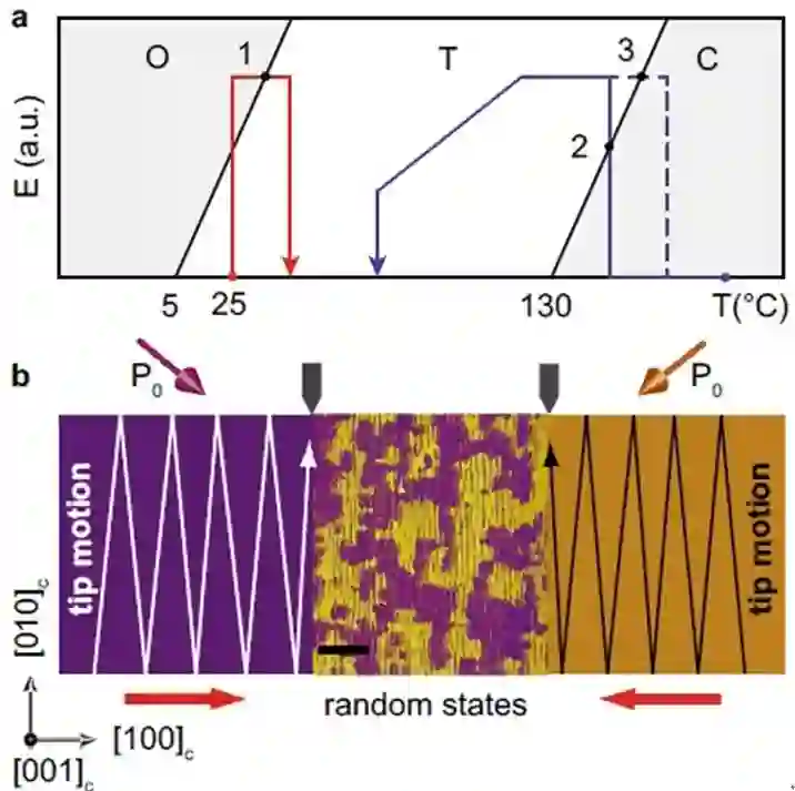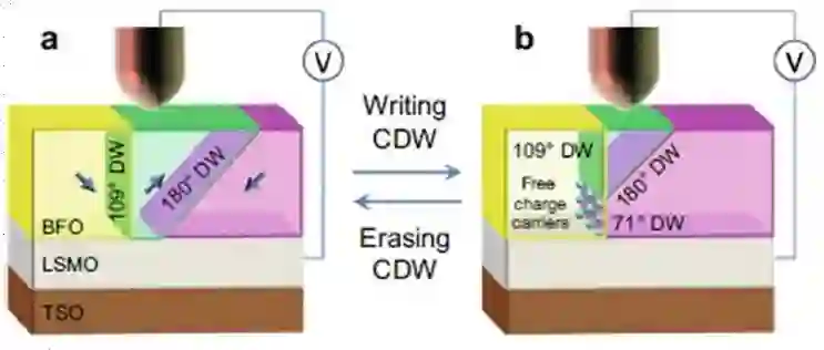 带电畴壁通常是两个畴之间的纳米级超薄界面;畴壁的两面由于自发极化存在法向分量的变化,畴壁常带有束缚电荷。与不同材料间的异质界面不同,带电畴壁(CDWs)可以在体材料中被反复创建、置换、擦除和重建。