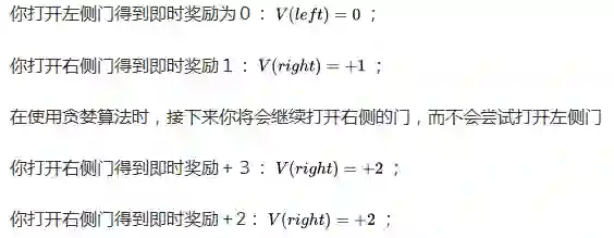 这种情况下,打开右侧门是否就一定是最好的选择呢?答案显而易见是否定的。因此完全使用贪婪算法改善策略通常不能得到最优策略。为了解决这一问题,我们需要引入一个随机机制,以一定的概率选择当前最好的策略,同时给以其它可能的行为一定的几率,这就是Ɛ-贪婪探索。