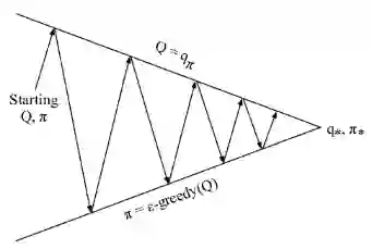 通用策略迭代的核心是在两个交替的过程之间进行策略优化。一个过程是策略评估,另一个是改善策略。如上图的三角形区域所示,从一个策略π和一个价值函数V开始,每一次箭头向上代表着利用当前策略进行价值函数的更新,每一次箭头向下代表着根据更新的价值函数贪婪地选择新的策略,说它是贪婪的,是因为每次都采取转移到可能的、状态函数最高的新状态的行为。最终将收敛至最优策略和最优价值函数。