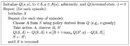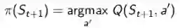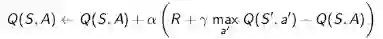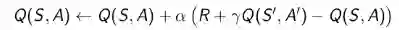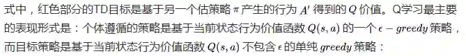 应用这种思想最好的方法是基于TD(0)的Q-学习(Q-learning)。它的要点在于,更新一个状态行为对的Q价值时,采用的不是当前遵循策略的下一个状态行为对的Q价值,而是采用的待评估策略产生的下一个状态行为对的Q价值。公式如下: