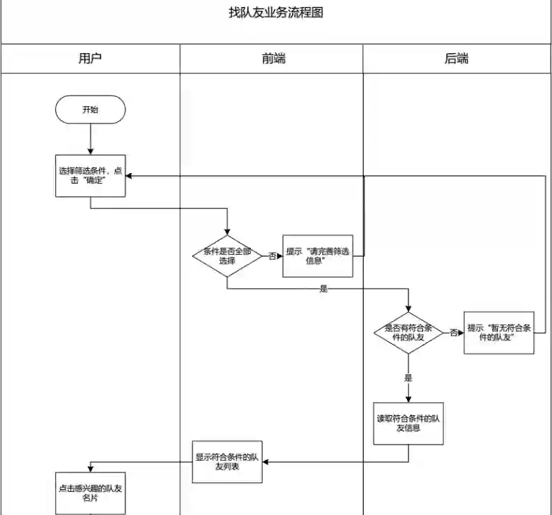 将核心需求“高效筛选寻找队友”落地,制作产品相关功能结构图以及流程图;