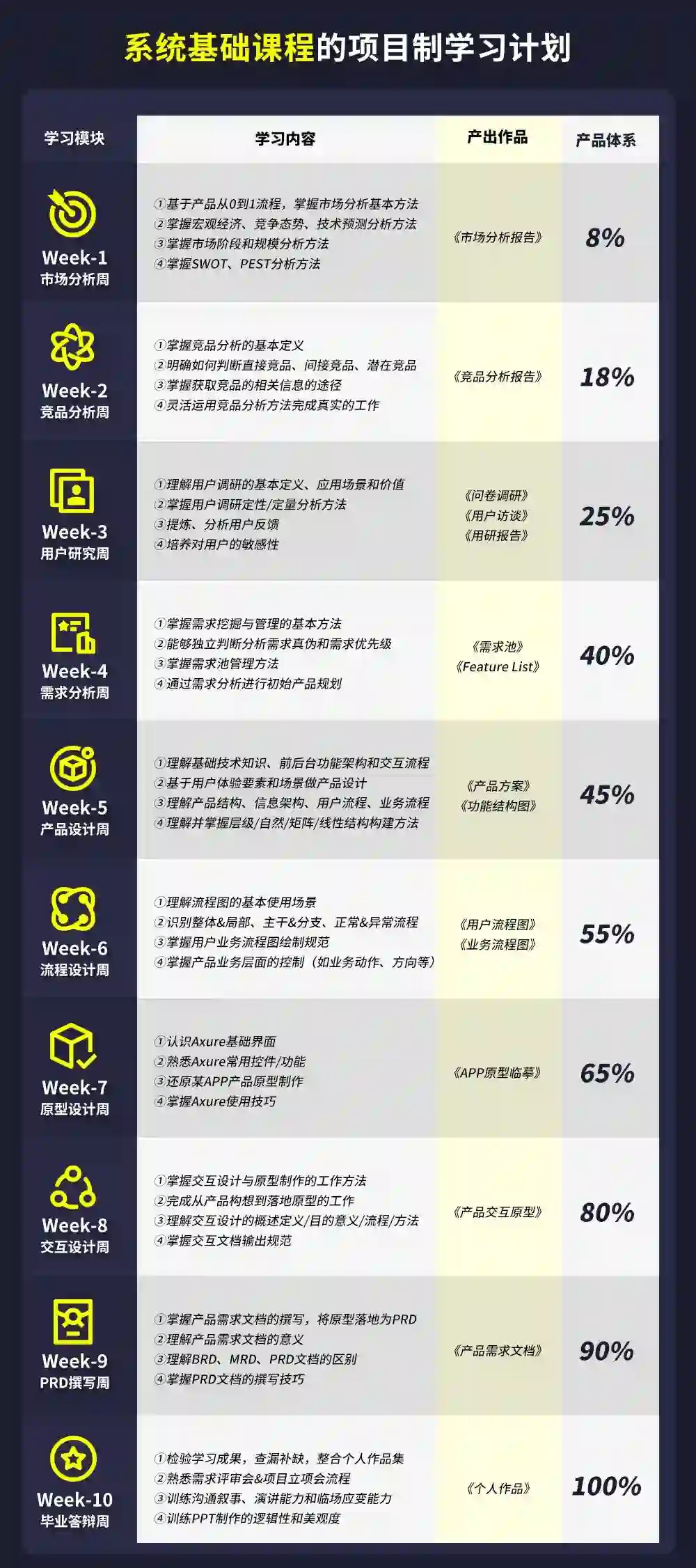 产品经理就业特训营10周高强度学习让你告别产品小白,系统化锻造产品思维,从0到1完整建立互联网产品经理知识体系。