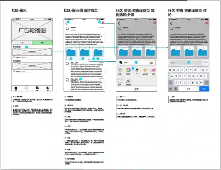 根据《产品规划设计》,输出清晰的产品原型V1.0,包括“首页、社区、信息、我的”四大模块,涵盖具体应用场景及交互设计。