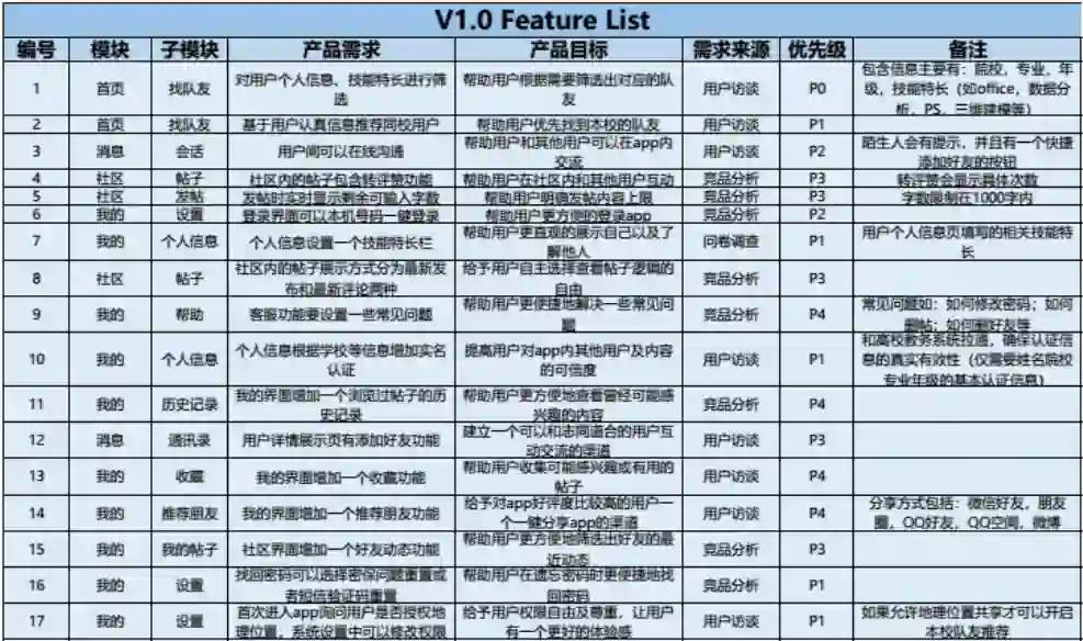 基于前期调研分析,了解到用户具有目标性非常明确的需求,以此为核心,有针对地提供筛选机制,高效寻找所需队友,建立需求池&Feature List;