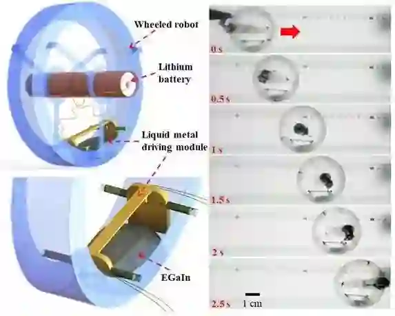 中国科学技术大学精密机械与精密仪器系副教授张世武研究团队、澳大利亚伍伦贡大学教授李卫华研究团队和苏州大学机器人与微系统中心副教授李相鹏研究团队组成的联合研究组,设计了基于镓基室温液态金属的新型机器人驱动器,首次实现了液态金属驱动的功能性轮式移动机器人。近日,该成果以 A Wheeled Robot Driven by a Liquid‐Metal Droplet 为题,发表在《先进材料》杂志上(Adv. Mater. 2018, 201805039)。