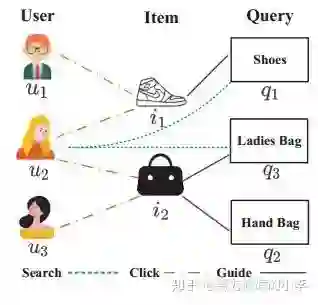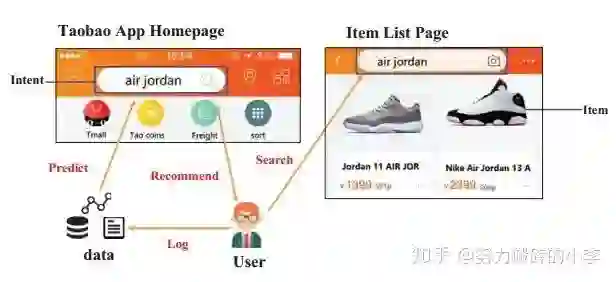 意图推荐,即不需要用户的任何输入,根据用户的历史行为进行推荐。下图为淘宝的意图推荐例子,根据用户的历史行为,预测出用户可能对air jordan感兴趣,在搜索栏中进行推荐,提示用户可以进行搜索。意图推荐不同于query推荐,它是根据用户的历史行为进行推荐,而不是之前相似的query;并且它不需要输入任何的query;意图推荐也不同于item推荐,它需要考虑用户、item、query的交互关系;并且用户的意图是经常动态变化的。