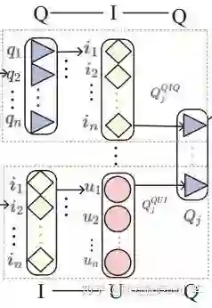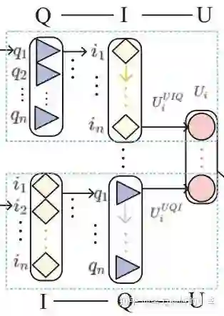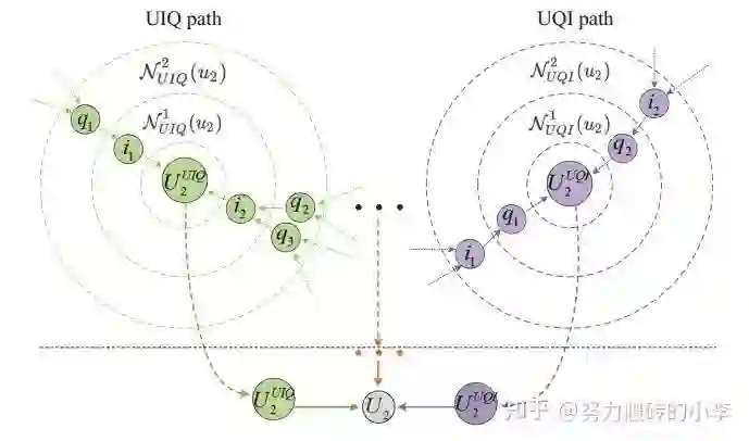 为了得到用户 的向量表示,对于左图路径UIQ来说,首先利用上一部分中的uniform term embedding得到query和item的向量表示,然后对邻居进行聚合。在聚合邻居的过程中,由于用户