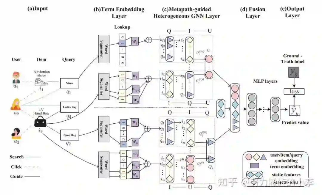 3. 利用异构GNN,聚合基于metapath的邻居embedding,来分别学习用户和query的向量表示;