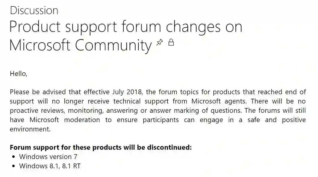 微软在官网论坛的一个帖子中宣布,自2018年7月起,停止在论坛上对 Windows 7 和 Windows 8.1/8.1 RT 相关主题的讨论提供技术支持。