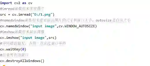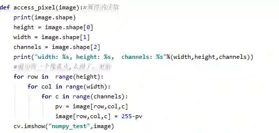 import cv2 as cvimport numpy as npdef access_pixel(image):#属性的读取print(image.shape)height = image.shape[0]width = image.shape[1]channels = image.shape[2]print("width: %s, height: %s, channels: %s"%(width,height,channels))#遍历每一个像素点,太慢了,更新for row in range(height):for col in range(width):for c in range(channels):pv = image[row,col,c]image[row,col,c] = 255-pvcv.imshow("numpy_test",image)def inverse(img):dis = cv.bitwise_not(img)cv.imshow("inverse",dis)def create_image():'''img = np.zeros([400,400,4],np.uint8)img[ :, :,0] = np.ones([400,400])*255 #对通道进行赋值,0是蓝通道,1是绿通道,2是红色通道,多通道cv.imshow("new_image",img)'''#初始化灰度图像img2 = np.zeros([400,400,1],np.uint8)img2[:,:,0] = np.ones([400,400])*127#img2 = img2*127cv.imshow("new_image_2",img2)#维度变换m1 = np.ones([3,3],np.uint8)m1.fill(12222.388)print(m1)m2 = m1.reshape([1,9])print(m2)print("---------HELLO-----PYTHON--------------------")src = cv.imread("D:/1.png")cv.namedWindow("input image",cv.WINDOW_AUTOSIZE)cv.imshow("input image",src)t1 = cv.getTickCount()#access_pixel(src)#create_image()inverse(src)t2 = cv.getTickCount()#测试时间消耗time = (t2-t1)/cv.getTickFrequency()print("time:%s ms"%(time*1000))cv.waitKey(0)cv.destroyAllWindows()