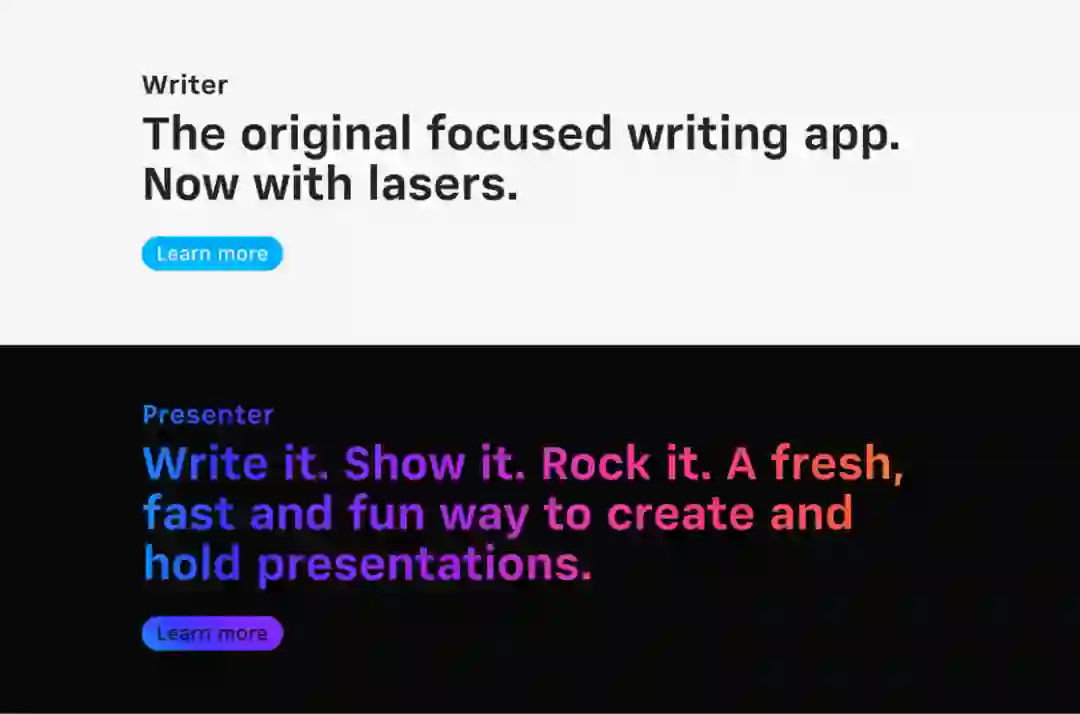 iA Presenter 的介绍页面延续了文本为主的家族风格,很好地传达了设计理念: