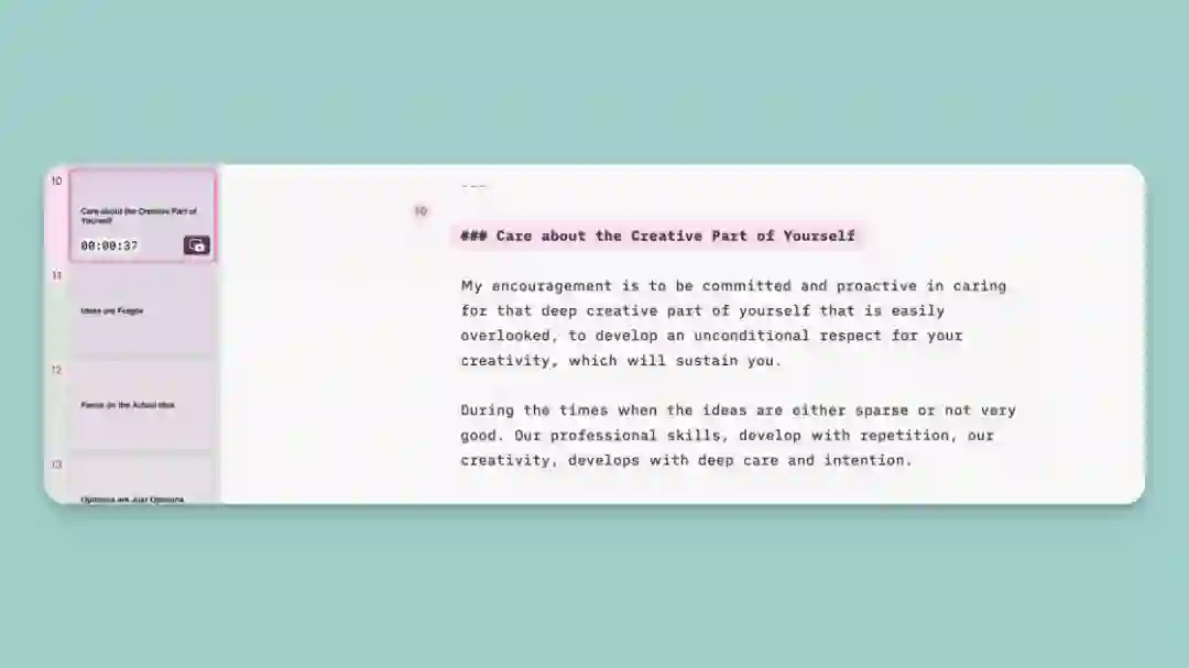 中间是主工作区,用来撰写要讲述的故事。在这里,可以用熟悉的 Markdown 格式把幻灯片「写」出来。但主要的特殊之处在于: