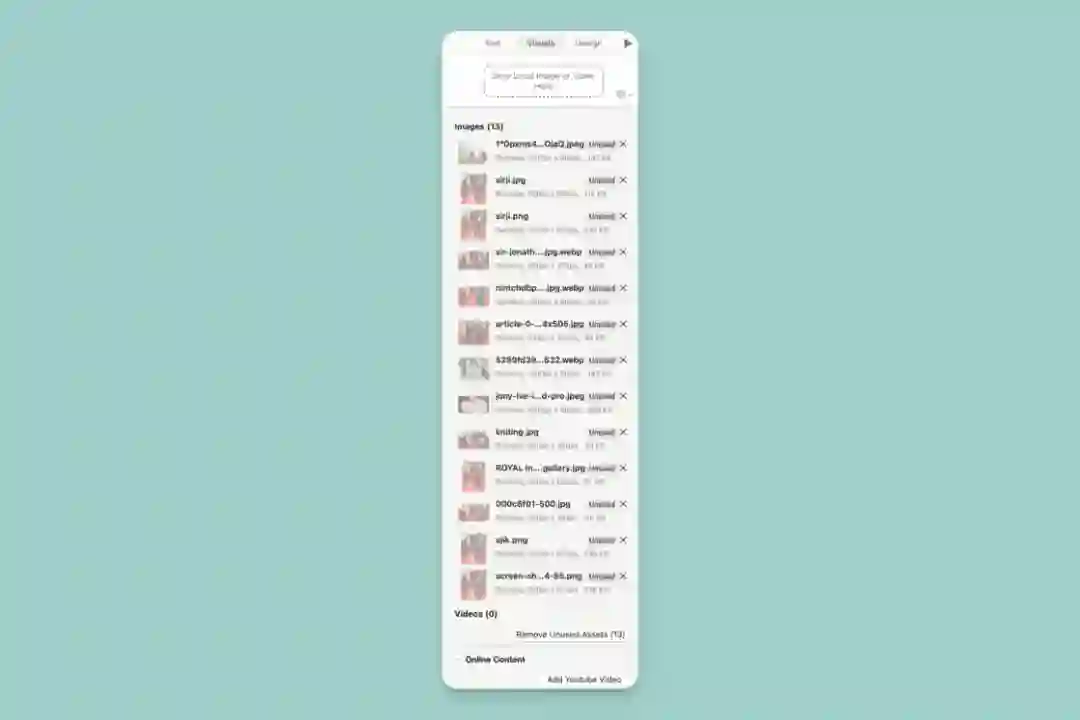 这个界面是幻灯片中的素材库。iA Presenter 支持通过拖拽的方式插入本地图片、视频,这些素材会显示在此处的列表中。你也可以预先将可能用到的文件先拖到库中,待写完文稿后再统一插入。(如果你用过 iA Writer,那么一定不会对这个操作逻辑感到陌生。)